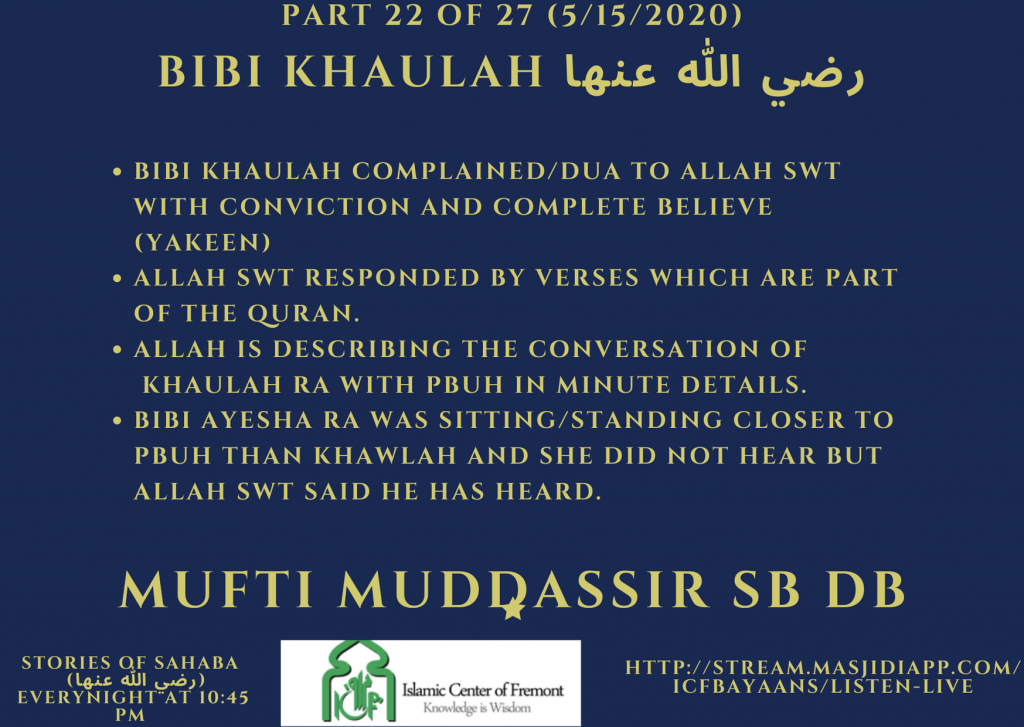 Learn from Story of Khaulah bint Tha’labah RA – part 22 of 27 Posted on May 15, 2020May 16, 2020 by mukarramn1