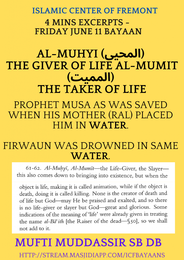 Summary of Al-Muhyi (المحيى) The Giver of Life Al-Mumit (المميت) The Taker of Life Posted on June 11, 2021June 15, 2021 by mukarramn1